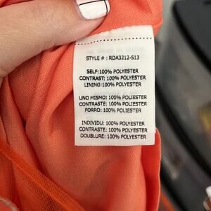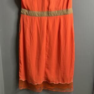 Pretty orange color with nude mesh around the neckline and bottom of the dress. Tan fabric across the middle of the dress.