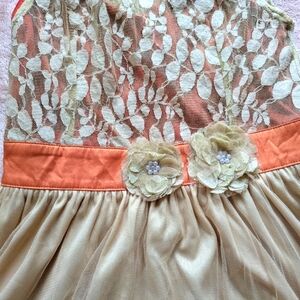 Charming peach dress featuring a lace bodice and floral accent. Perfect for special occasions.