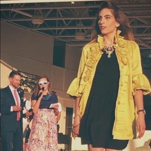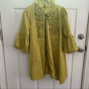 This beautiful statement piece has cascading flowers with ruffles, bell sleeves, snap closure and pockets. Worn a few times.