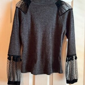 Very dressy grey Ryu sweater with lace insets and sleeves. Covered buttons.