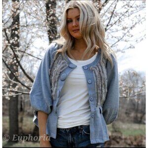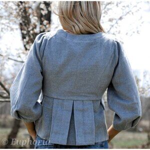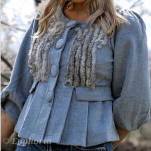 Adorable spring jacket with feminine fit and details! Handmade from quality materials. Short length. 3/4 bloused sleeves. Round neck. Snap close with round cloth covered button accent. Front flap pockets. Genuine fur trim accent. Pleated hem for flattering fit.