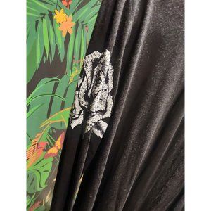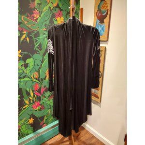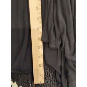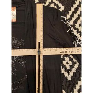 S 12 Women's Black Shawl Open Cardigan Graphic & Bling Sharkbite Hem. Sz Medium