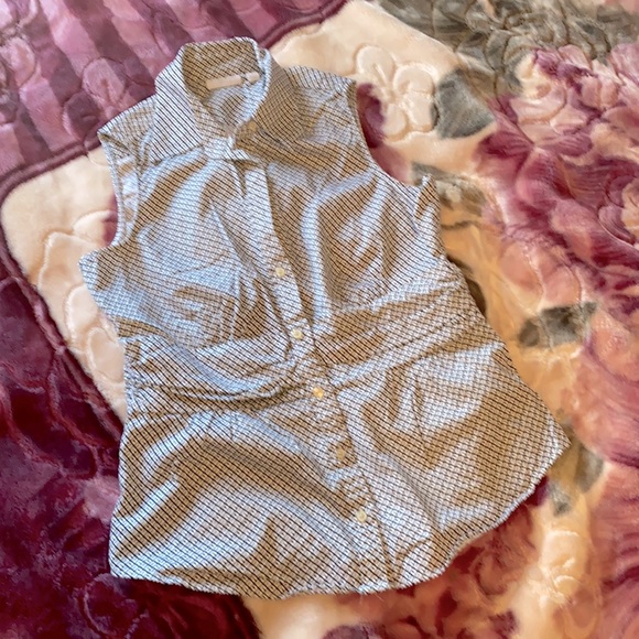 New York & Company sleeveless shirt, black and white, ruching around waist.