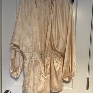 Chic satin romper with bell sleeves & floral jacquard detail. Tags on. Medium.