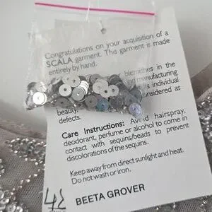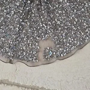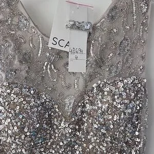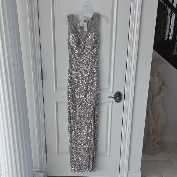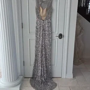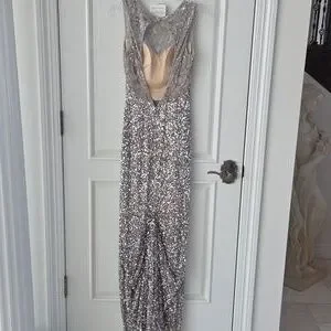 Elegant dress with shimmering silver sequins. Features intricate detailing. Worn once for prom. Perfect condition, except for one little spot where the beading came off, but easy to add silver sequence. There's a little bag of extra. Beautiful dress on.