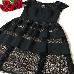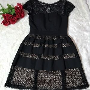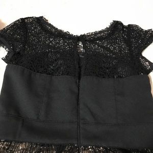 black stripped dress with gold slip. lace neckline and partially lace skirt. worn to one formal event and never worn again. bought originally from ModCloth for $85. keyhole button with zipper on back.