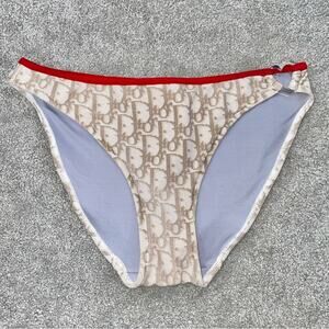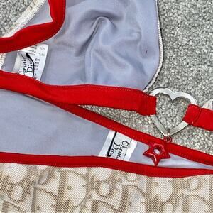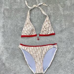 S AUTH VTG Christian Dior Tan Red Charm Trotter Logo Print Bikini Swimsuit