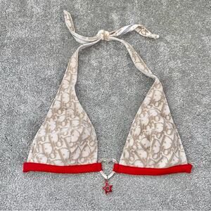 Authentic Christian Dior Tan & White Trotter Logo Print Halter Bikini Swimsuit with Red Trim. Has Silver Heart Connectors with a Red Plastic Logo Star Charm.