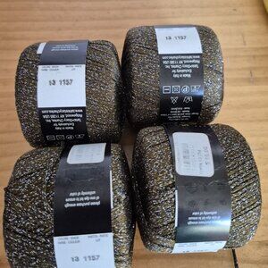 Stella---74% Silk and 26% Lurex in metallic brown/gray. The color is called "shade" and all 4 balls are unopened and the same lot as can be seen from the photos. This yarn would be great as an addition to a silk or wool project to add a touch of bling or on its own. Each skein is 76 yards. There are 4 skeins. Knitting needle recommendation is #8 and crochet hook is H. This yarn is made in Italy.