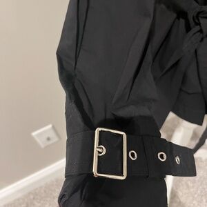 This jacket is gorgeous! Only worn once. Can be worn full or fitted at the waist. Has several layers that are combined to make the jacket fun and fashionable. Please refer to photos. Size Small and all Black besides chrome buckles.