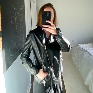 Vegan leather jacket by Blu Pepper - I've lost weight since I purchased a few years ago so it's a bit big on me now. I'm 5'3" and 100 lbs for reference. It's a good quality jacket and was purchased at a nice boutique here in Austin. Haven't worn it for a couple years so it's a bit collecting dust :).