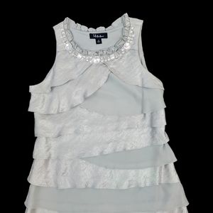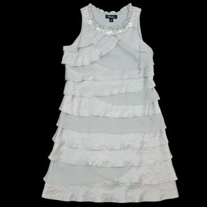 This is a beautiful silver dress with rhinestones and beads at the neckline below a delicate ruffle. The tiers have a sheen to them and are layered with a flowy, light grey chiffon like fabric in between. It has an invisible side zip for a clean, seamless look. This dress is absolutely fabulous. It would be perfect for a formal event or a wedding!
