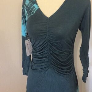 Made of a soft and stretchy material. Made with intentionally raw edges. Measures 17 inches across the bust and is about 38 inches in length. 3/4 length sleeves. Ruching in the front. Made in southern California and hand dyed. Price firm.