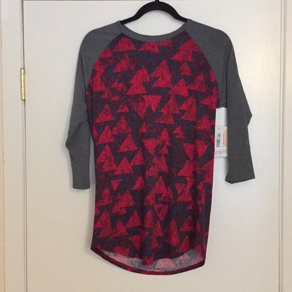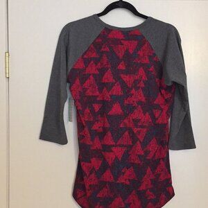 This is a brand new Lularoe "Randy" Tee. It still has the tags attached. It has a navy blue and red design on it and gray sleeves The sleeves are 1/2 length. Price firm unless bundled. Thanks for looking.