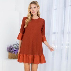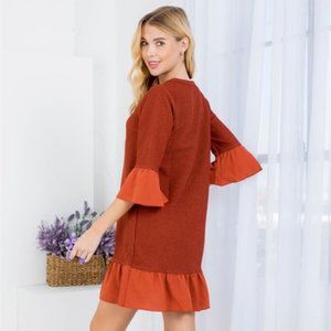 S M RUST ROUND NECKLINE RUFFLE HEM & SLEEVE MINI DRESS