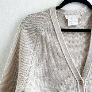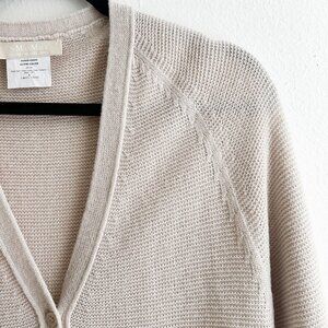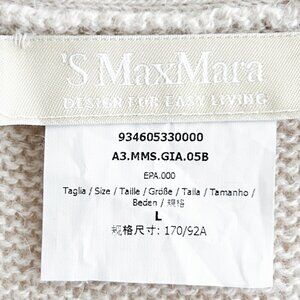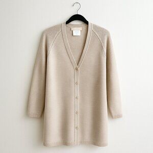 ‘S Max Mara longline cardigan sweater in a neutral beige tone. Crafted in Italy, this luxury knit features a button front closure, deep V-neckline, and a textured cashmere wool-blend design that highlights the brand’s refined minimalist aesthetic. Long sleeves and ribbed trim add subtle structure while maintaining a soft, relaxed fit. Size Large. Excellent pre-owned condition with no visible flaws.