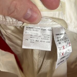 Mid-rise trousers in cotton silk blend fabric featuring a zip and concealed hook-and-bar fastening. The wide leg is embellished with pressed pleat detail and a topstitched turned-up hem. Side pockets are red with Velcro to keep items in.