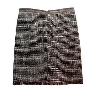 DETAILS: S’ Max Mara Pencil Skirt in brown/black tweed pattern with fringe trim accent. Slit pockets and zip closure. No fabric or size tag but feels/looks like wool. Listing as size medium but see measurements.in photos. It could probably fit an 8 or. 10.