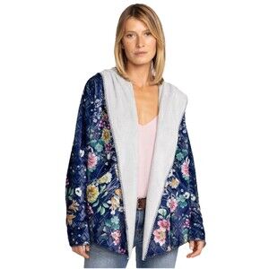 The size small $198 Johnny Was Biya Bursting Echo Sherpa Hoodie is a stylish and comfortable fleece jacket perfect for casual occasions. Made of polyester with a floral pattern in blue, this relaxed fit jacket features long sleeves and an open closure. The jacket is designed with pockets for added functionality and is part of the JOHNNY WAS collection. Ideal for women looking for a basic jacket with a unique style and quality construction.