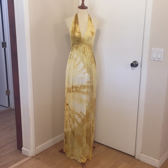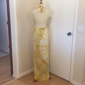 This is a brand new LOVE TANJANE halter dress. Soft and stretchy material. Intentionally raw edges. I am not sure how I would give meaningful measurements due to the open back and adjustable length due to being able to alter where it is tied in the back. I will mention though, that this fits true to size and my mannequin is currently set to a height of 5'6. Made in southern California and hand dyed. Price is firm. Thanks for looking.