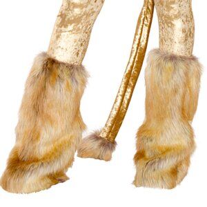 Let them hear you roar! Go on the prowl in this Queen Of The Jungle costume featuring a tan long sleeve bodysuit with a faux fur trim, a deep V-neckline with a front zipper closure, a cheeky cut back, an attached furry hood with ears, and an attached tail. (Boot covers not included.)