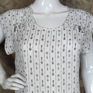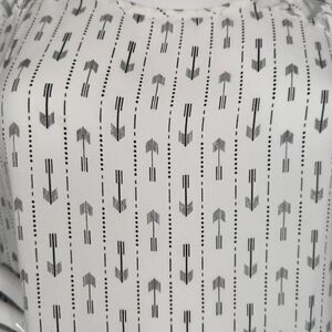 Features: Lightweight cap sleeve blouse, white with black arrow print, pullover, semi sheer