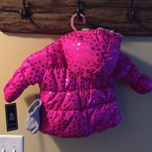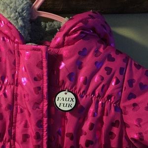 S. Rothschild pink heart winter jacket. Size 6-9mo. Faux fur interior. NWT. Grey fleece mittens included, also new. Non-smoker. No issues whatsoever.