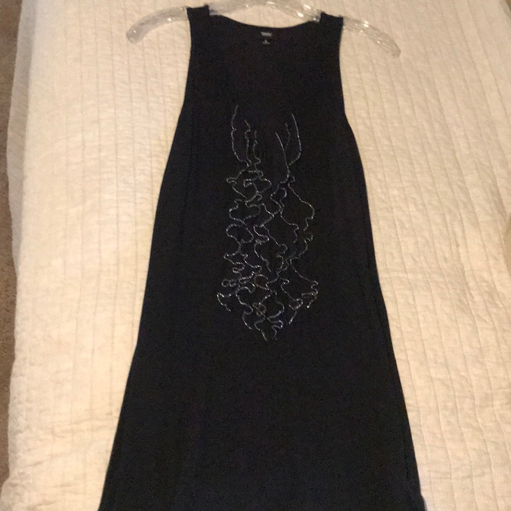 Long tank top with ruffled front lined with silver stitching. Bought for a New Year’s party a few years ago and never wore.Smoke free home