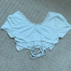 Ties in the front or back, lace detailing around neck and bottom of crop top.