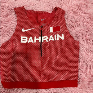 Introducing the Nike Pro Elite Bahrain Official Track & Field Racing Crop Top, perfect for women who love athletic wear. Designed with a sleeveless feature and a zip closure, this tank top provides comfort and breathability during your workout routines. It comes in a vibrant red color and is made of lightweight and moisture-wicking fabric, making it perfect for summer, fall, and spring seasons.