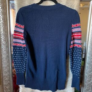 Great condition! Not sure if vintage but no tags. Navy with red and white fair isle print v neck sweater. Best for size small. No flaws.