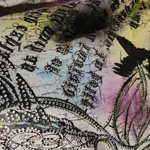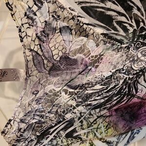 Crystal embellishments adorn this lightweight top with word print. Slightly longer sides gives a flowy boho look. Lace cut out detail on the back for a peekaboo effect. Breathable and fun to wear.