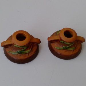 S/2 Vintage Ceramic Roseville Pottery Brown / Tan Freesia Candlestick Holders