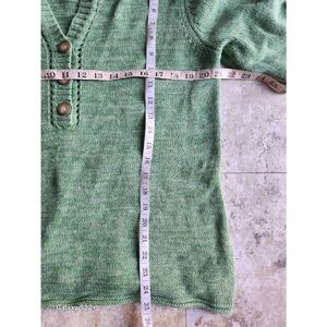 The Eddie Bauer Heather Green 1/2 button V-neck sweater is a stylish and versatile piece for women. Made from tight-knit cotton material, this sweater in size XL features a relaxed fit and long sleeves, perfect for casual, business, or travel occasions. The V-neck design, button accents, and collarless style add a touch of sophistication to this pullover sweater in a classic green color. Ideal for winter, fall, or spring seasons, it is a timeless wardrobe essential from Eddie Bauer.