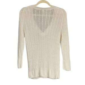 Keywords: J. Crew, linen sweater, V-neck sweater, cable knit sweater, lightweight sweater, white sweater, women's sweater, spring sweater, summer sweater, casual sweater, dressy sweater, size small, linen knit, breathable sweater, classic sweater