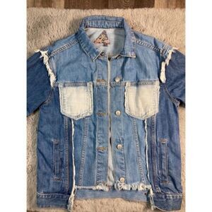 Signature Eight frayed denim patched up jacket with button front closure and functional side pockets