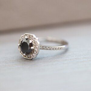 S925 1cttw Black Moissanite Diamond Flower Halo Style Engagement Ring Sterling Silver Stamped 925