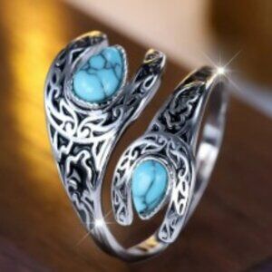S925 Sterling Silver Vintage Boho Horseshoe Turquoise Carved Ring – adjustable