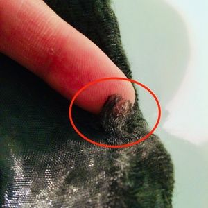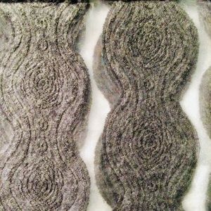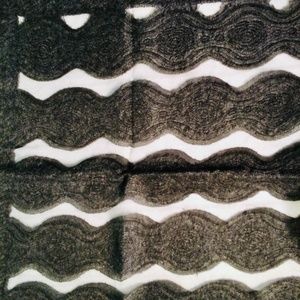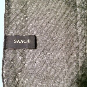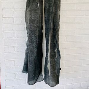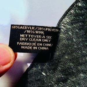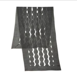SAACHI Charcoal Gray Wave Pattern Acrylic, Polyester, and Wool Blend Scarf. Features circular wave pattern on a shear background. Measures approximately 44 inches L x 28 inches W. 60% acrylic, 30% polyester, 10% wool. Dry clean only. Made in China. New without tags. Note: there is a small tuff or snag of material that sticks out on what I think is the back side (unsure), see last photo.