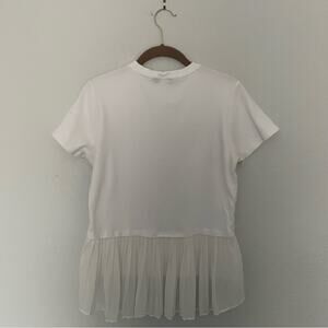 SABIE Coquette white tee top Hi-Lo size medium in good condition. Pretty pleated sheer material on the back hem. Body 100% cotton. Contrast 100% polyester. Please see measurement photos for best fit. Get the best deals when you bundle items together. I’ll respond to any offer you send me. 0929-2404