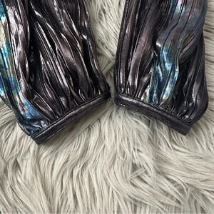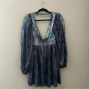Turn heads in this show-stopping mini dress featuring a twist-adorned V-neckline, slightly defined shoulders, and exaggerated sleeves in a stunning, metallic plisse fabrication designed to add daring dimension to your dress collection.