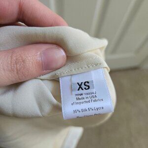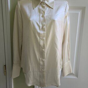 SABLYN Vincent B Slim Fit Button Down Top in Gardenia Size XS - excellent like new condition, just needs a good steaming. 95% silk, 5% lycra materials. Dry clean only. Front button closure down the front buttons. Buttoned cuffs, wide cuffs. Satin soft silky fabric. Cream color. Retails for $629. Designer luxury piece, minimalistic chic. Glam. Casual, work attire, or formal wear appropriate. Classic timeless piece. Staple piece. Refined office piece. Gardenia color. Luxurious silk. Pointed collar. Contemporary fashion.