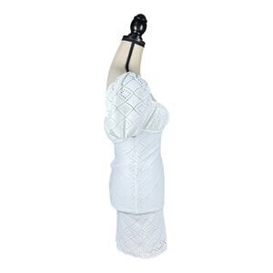 SABO Designed In Australia Pascal White Lace Dress in a size small. Puffy elastic sleeves. Lined except for sleeves. Sweetheart neckline with underwire. Back concealed zipper closure with eye and hook. 95% polyester, 5% spandex. Measures approximately 15” armpit to armpit, and 32” in length. In great condition.