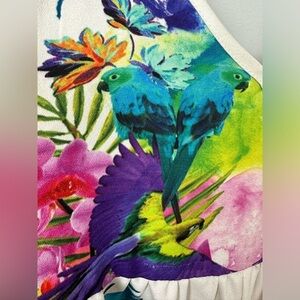 Sabo Skirt White romper with a beautiful vibrant tropical birds print. Spaghetti straps and a V-neckline.