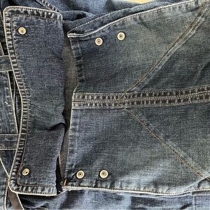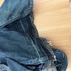 wrinkled, loose threads, white mark on fabric next to zipper fly