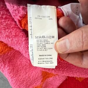 This head-turning piece by Sacai is presented in 100% soft, shag knit cotton with argyle check pattern in red, orange, and pink throughout. · Paneled construction · Rib knit Y-neck, hem, and cuffs · Button closure · Press-stud vent at side seams.
