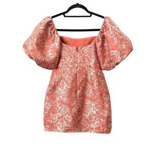 Rose pink mini sheath dress with large puff sleeves. Metallic floral design throughout. Square neckline. Zippered closure on back. Lined. 100% polyester. New with tags! Size 0