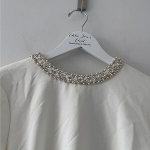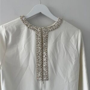 The Parker Dress is the easy, timeless and elegant look you have been searching for. The dress features an embellished neckline and back detail, thick stretch crepe fabric, and a mini-length silhouette. Complete this bridal look with some heels and earrings and you are ready for any wedding event!