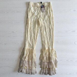 Elegant cream bellbottom lace pants with a flattering fit. Perfect for bohemian styles or vintage-inspired looks. New with tags, crafted for comfort and style.