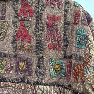 Gorgeous multicolor cotton button down jacket with abstract animal-shape and floral appliqués.